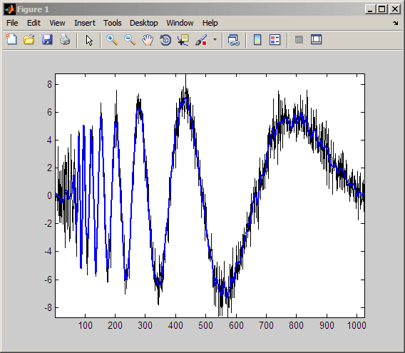 rsig = wprcoef(Topt,7); % rsig is length 1024 plot(noisdopp,'k'); hold on; plot(rsig,'b','linewidth',2); axis tight;