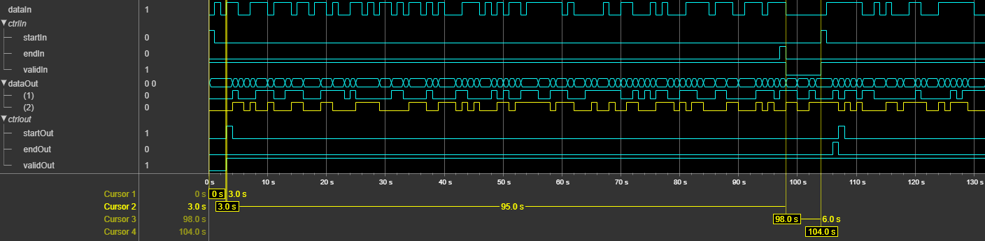 Задержка блока составляет три тактовых цикла, поэтому блок возвращает первые закодированные выходные данные после трех тактовых циклов. В Terminated после окончания кадра блок сбрасывает кодированные состояния во все нулевые состояния путем добавления битов (длина ограничения - 1). Таким образом, форма сигнала показывает зазор между кадрами шести (Длина ограничения - 1) тактовых циклов между концом кадра (startIn.endIn) и началом следующего кадра ctrlln.startIn.