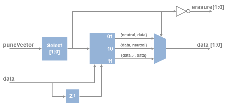 Многие стандарты беспроводной связи реализуют различные скорости кодирования путем прокалывания шаблонов с базовой скоростью кодирования 1/2. Вход в блок представляет собой поток по одной выборке за раз. Можно предоставить образцы, представленные двоичными значениями жесткого решения или логарифмическими коэффициентами правдоподобия мягкого решения (LLR). Блок возвращает выходные выборки в виде векторов 2 на 1.