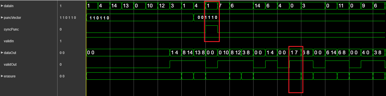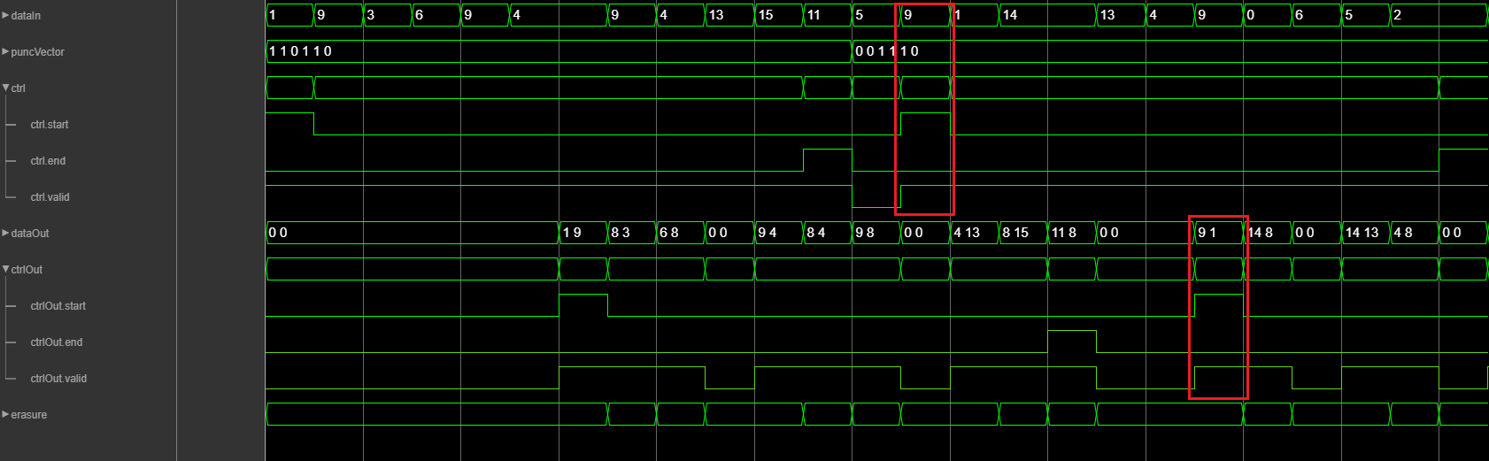 syncPunc - Сигнал синхронизации проколаСигнал синхронизации прокола, указанный как Boolean скалярное значение. Этот вход является управляющим сигналом, который синхронизирует вход вектора прокола с входным образцом. Если оба параметра syncPunc и valid 1 (true), блок выравнивает вектор прокола для начала прокола. Блок захватывает вектор из входного порта puncVector или из параметра Puncture vector. Блок игнорирует порт puncVector, когда syncPunc имеет значение 0 (false).