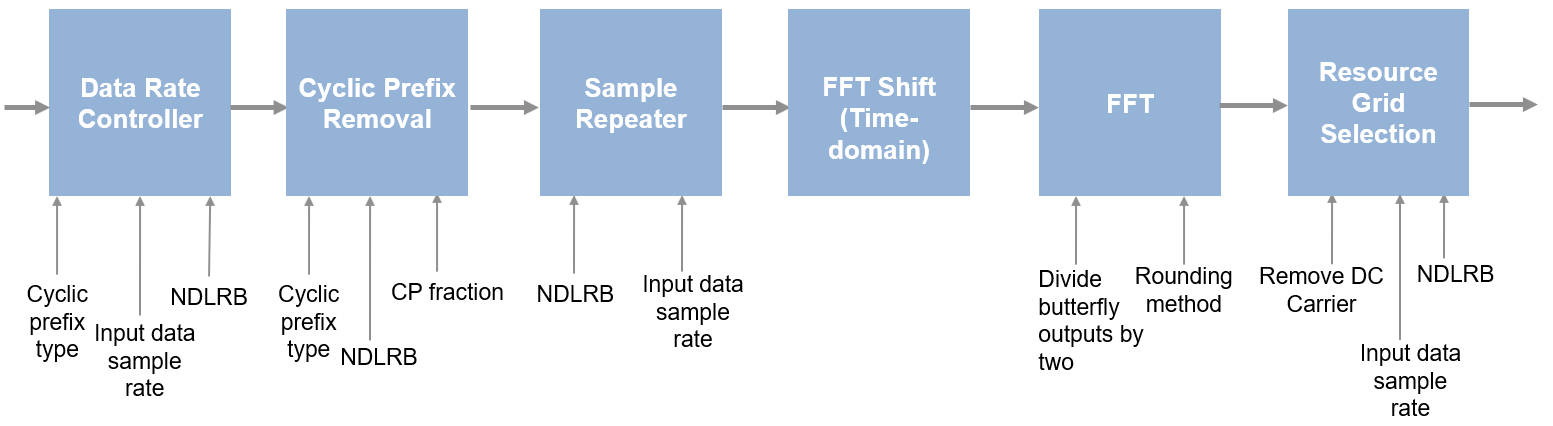 Блок принимает входные данные либо с максимальной скоростью 30,72 МГц, либо с частотой дискретизации, соответствующей NDLRB. Входные частоты дискретизации для NDLRB 6, 15, 25, 50, 75 и 100 составляют 1,92 МГц, 3,84 МГц, 7,68 МГц, 15,36 МГц, 30,72 МГц и 30,72 МГц соответственно. Блок использует 2048-точечное быстрое преобразование Фурье (FFT) для всех значений NDLRB и возвращает количество выборок сетки ресурсов, необходимых для выбранного NDLRB. По умолчанию блок исключает носитель постоянного тока.