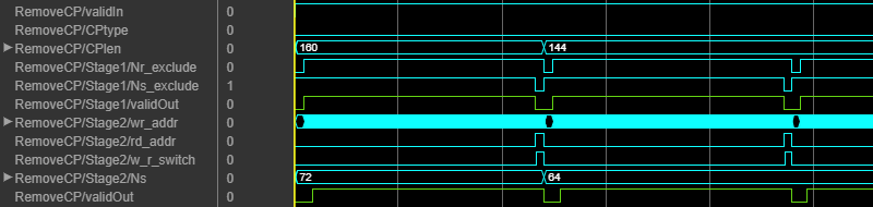 Параметр фракции CP управляет количеством выборок, удаляемых блоком в начале символа. Блок сдвигает остаток циклического префикса с начала символа на конец символа. Блок квантует долю СР в fi(0,11,10). Для достижения целого числа выборок блок вычисляет Nr = floor (фракция Ncp * CP).