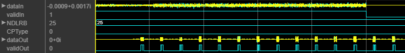 Для NDLRB 25 блок возвращает 12 × 25 = 300 выборки сетки ресурсов. Блок указывает местоположение этих выходных выборок с сигналом validate Out, установленным на1 Правда. Сигнал validedOut: 0 (false) в центре выходных выборок, чтобы исключить несущую постоянного тока.