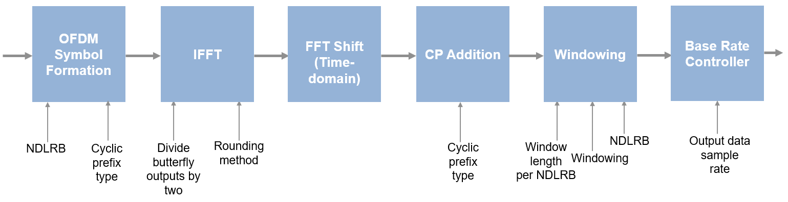 Последовательность операций блока OFDM-модулятора LTE переносится с использованием этих блоков: формирование символов OFDM, IFFT, сдвиг FFT, добавление CP, оконное отображение и контроллер базовой скорости. Блок формирования символов OFDM отображает входной сигнал сетки ресурсов в активные ячейки поднесущих для формирования 2048 поднесущих. Блок ОБПФ преобразует сигнал частотной области в сигнал временной области, и блок сдвига БПФ выполняет сдвиг БПФ временной области. Блок добавления CP добавляет выборки длины CP от конца символа к его префиксу. Блок Windowing выполняет оконную обработку и перекрытие соседних OFDM-символов комплексных символов в массиве ресурсов. Блок контроллера базовой скорости определяет частоту дискретизации выходных данных. Параметры, показанные на следующем рисунке, настраивают поведение блока.