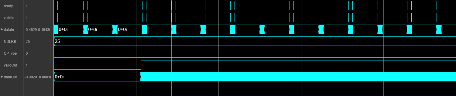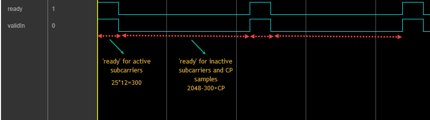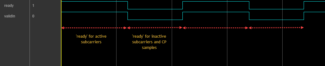 Блок выдает сигнал из порта готовности, чтобы указать, когда блок готов принять входные данные. Этот сигнал зависит от действительного входного сигнала, NDLRB, типа CP и номера символа OFDM. Готовый выходной сигнал генерируется для одного временного шага, и действительный входной сигнал проверяется для следующего временного шага. Блок принимает входные данные, и готовый выходной сигнал остается высоким (1) до тех пор, пока не будут приняты данные символа OFDM. Если допустимый вход низкий (0), сигнал готовности продолжается до тех пор, пока действительный входной сигнал не получит высокий уровень (1). После приема активных поднесущих блок устанавливает готовый выходной сигнал на низкий (0) за период времени, равный сумме количества неактивных поднесущих и количества выборок СР.
