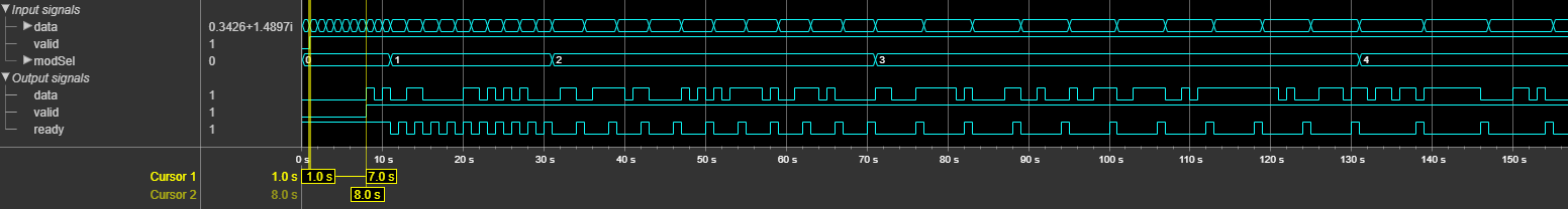 Блок принимает символы данных вместе с действительным сигналом и выводит демодулированные биты или значения LLR с действительными и готовыми сигналами. Количество демодулированных битов или значений LLR для данного символа зависит от типа модуляции, как показано в этой таблице.