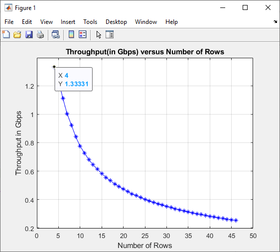 На этом графике показана пропускная способность по сравнению с количеством строк, указанным на входе блока, если для параметра Algorithm задано значение Min-sum, параметр Количество итераций для 8и входной порт bgn для 0.