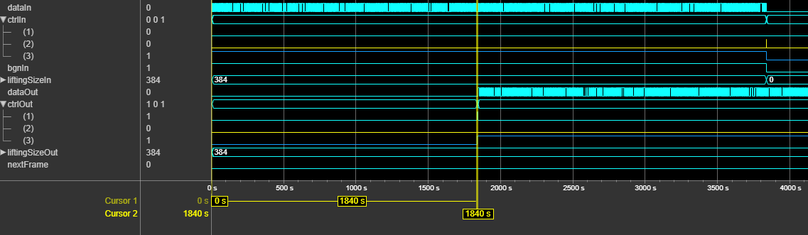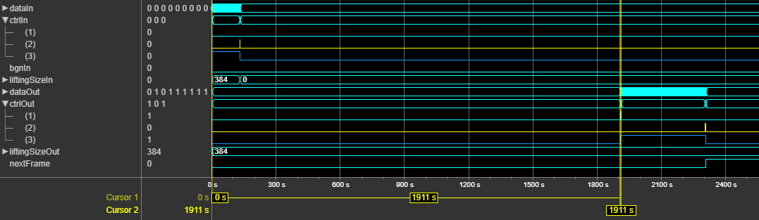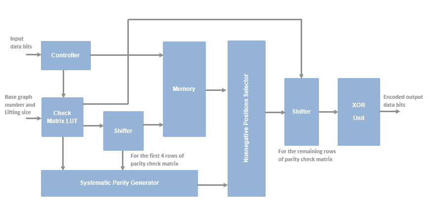 Блок кодера NR LPDC реализует кодер с низкой плотностью контроля четности (LDPC) с аппаратными управляющими сигналами. Блок принимает биты данных, поток управляющих сигналов, номер базового графа и размеры подъема. Блок выводит кодированные биты, поток управляющих сигналов, размеры подъема и сигнал, который указывает, когда блок готов принять новые входы.