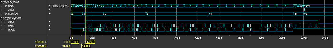 Блок принимает символы данных вместе с действительным сигналом и выводит демодулированные биты или значения LLR с действительными и готовыми сигналами. Количество демодулированных битов или значений LLR для данного символа зависит от типа модуляции, как показано в этой таблице.