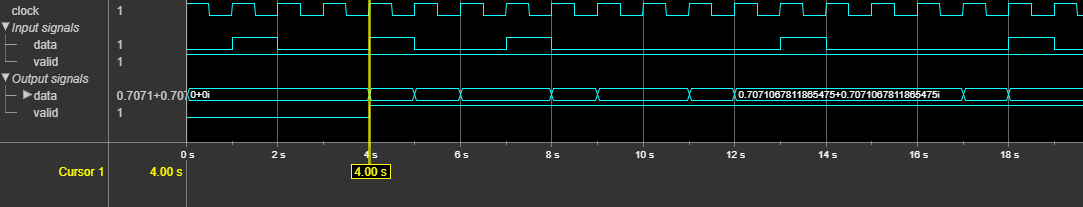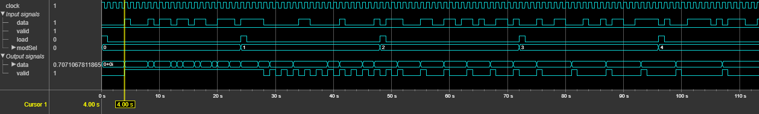 Блок одновременно принимает 1-бит данных вместе с управляющими сигналами и выводит модулированный комплексный символ с достоверным сигналом. Каждый комплексный символ содержит стандартное количество битов на основе типа модуляции, как показано в следующей таблице. Если в качестве входных данных ввести несколько битов порядка модуляции, блок игнорирует выходной символ с недостаточным или избыточным количеством битов. Порядок модуляции - это количество битов на символ.