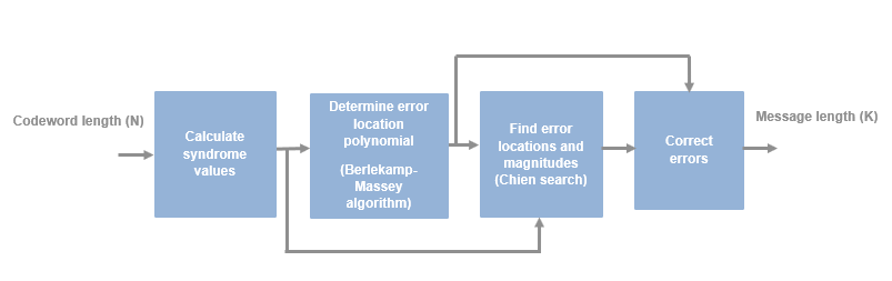 Блок декодера RS декодирует и восстанавливает сообщение от кодового слова Рида-Соломона (RS). Блок принимает данные кодового слова и samplecontrol шину и выводит декодированные данные сообщения, samplecontrol шину, повреждены ли принятые данные, индикатор готовности блока и (необязательно) количество исправленных ошибок. Блок обеспечивает архитектуру, подходящую для генерации кода HDL и аппаратного развертывания, и поддерживает укороченные длины сообщений.