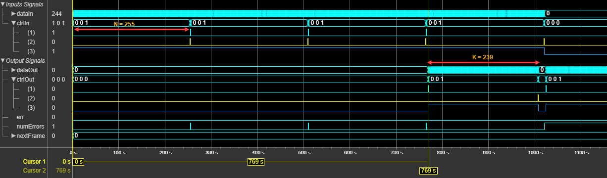Поскольку задержка блока изменяется, блок предоставляет выходной порт nextFrame, который указывает, когда блок готов принять новые входные данные кодового слова. Дополнительные сведения о задержках см. в разделе Алгоритмы.