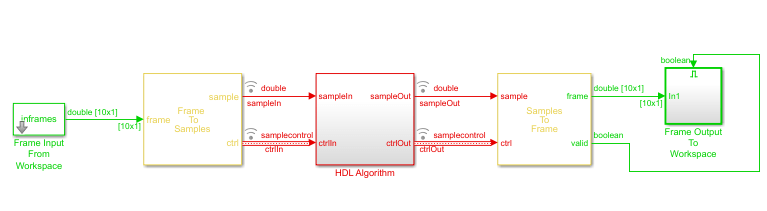Выход подсистемы алгоритма HDL соединен с блоком Samples To Frame. Этот блок преобразует выходные данные обратно в данные с кадрами для экспорта в рабочую область MATLAB.