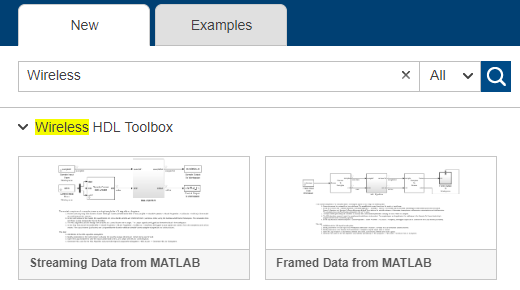 На начальной странице Simulink найдите раздел Wireless HDL Toolbox™ и щелкните шаблон Streaming Data from MATLAB или Framed Data from MATLAB.