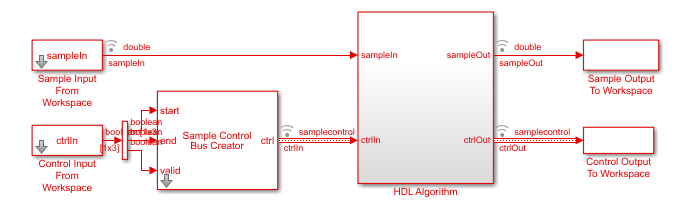 Для подключения к подсистеме алгоритма HDL и любым добавляемым в нее блокам панели инструментов Wireless HDL модель преобразует управляющие сигналы в samplecontrolbus введите, используя блок Sample Control Bus Creator.