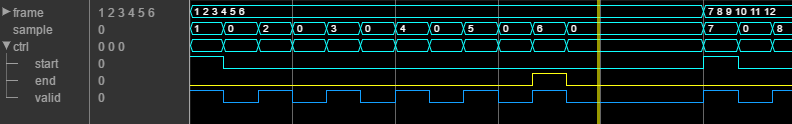 Управляющие сигналы start и end равны 1 для первой и последней допустимых выборок кадра соответственно. valid сигнал равен 1 для каждого действительного входного образца. valid сигнал равен 0 для циклов простоя, вставленных между выборками и между кадрами. Кадр из шести выборок теперь представлен потоковыми данными в течение 15 циклов.