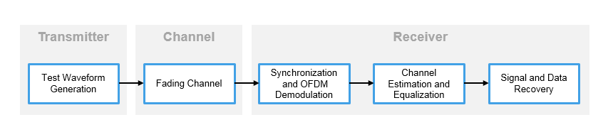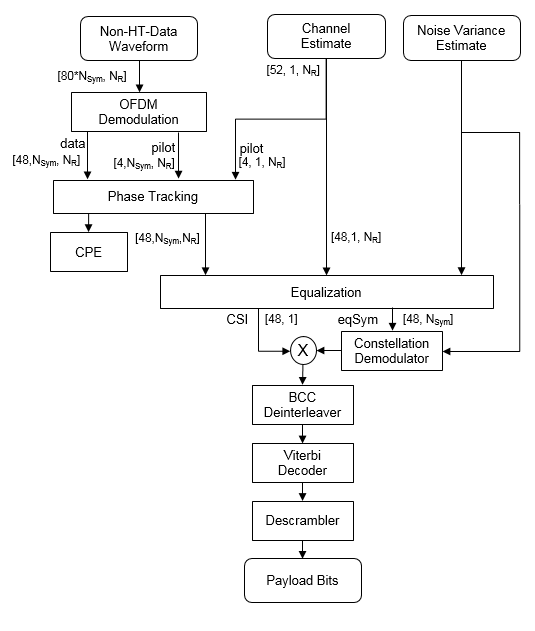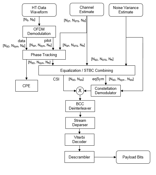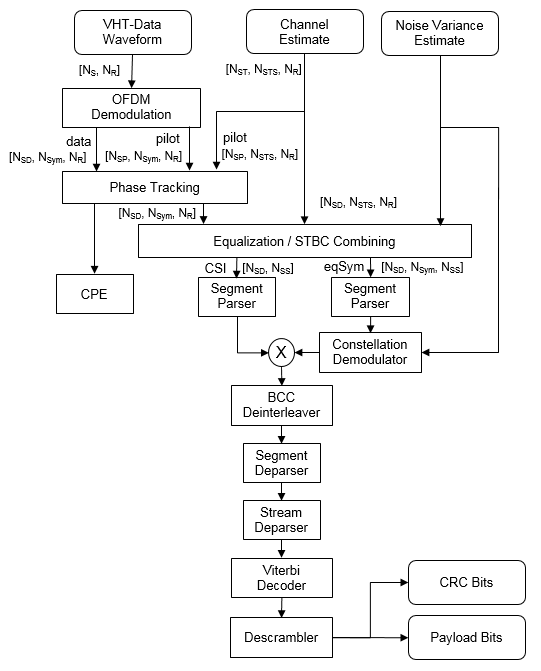 Функции панели инструментов WLAN позволяют восстанавливать передаваемые PPDU формата VHT, HT-смешанные и не-HT. Цепочка обработки приема включает в себя синхронизацию, демодуляцию OFDM, оценку канала, выравнивание и восстановление сигнала и данных.