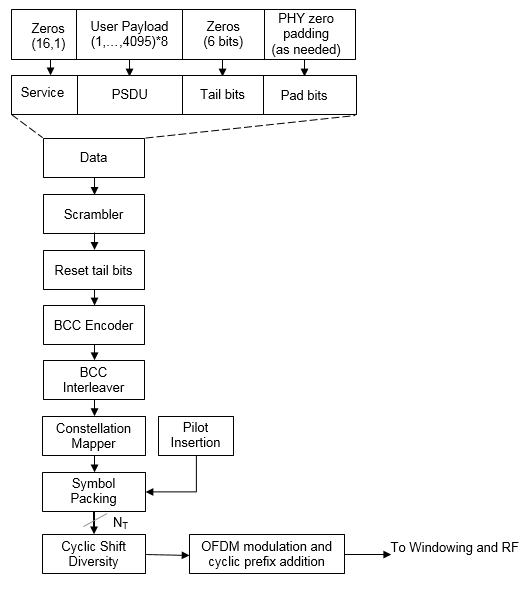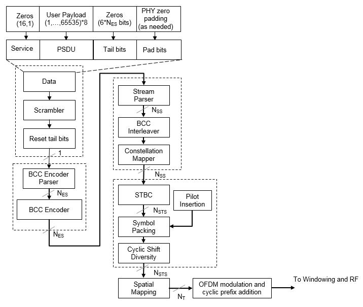 IEEE 802.11-2012 [3], раздел 18 определяет требования к обработке на физическом уровне, связанные с каждым полем PPDU для схемы модуляции OFDM. IEEE 802.11-2012 [3], раздел 17 и раздел 19 определяют требования к обработке на физическом уровне, связанные с каждым полем PPDU для схемы модуляции DSSS.