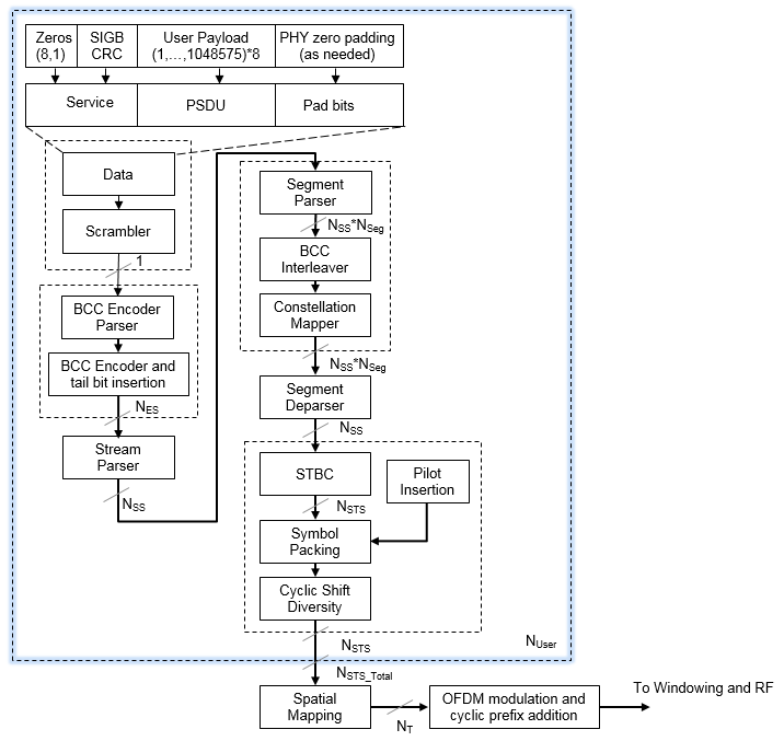 Как описано в IEEE 802.11ac™-2013 [4], раздел 22 определяет объект PHY для системы мультиплексирования с ортогональным частотным разделением каналов (OFDM) с очень высокой пропускной способностью (VHT). VHT STA должен быть способен передавать и принимать HT-PHY и не совместимые с HT-PHY PPDU. В частности, VHT PHY основан на HT PHY, определенном в разделе 20, который, в свою очередь, основан на OFDM PHY, определенном в разделе 18. VHT PHY расширяет максимальное количество поддерживаемых пространственно-временных потоков до восьми и обеспечивает поддержку многопользовательских (MU) передач нисходящей линии связи. Передача МУ нисходящей линии связи поддерживает до четырех пользователей с до четырех пространственно-временных потоков на пользователя, при этом общее количество пространственно-временных потоков не превышает восьми.