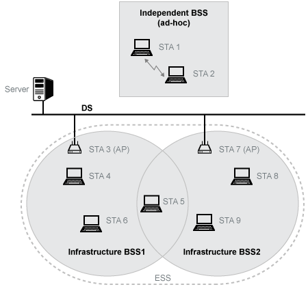 IEEE 802.11 определяет сетевые архитектуры. В IEEE 802.11 группа станций (STA) в пределах определенной зоны обслуживания и с соответствующей связью друг с другом формирует базовый набор услуг (BSS). BSS является базовым компоновочным блоком для сетевой архитектуры 802.11. Базовая область обслуживания (BSA) определяет область, содержащую STA в BSS. STA могут быть связаны в перекрывающихся BSS. С точки зрения мобильности STA являются фиксированными, портативными или мобильными. Любой совместимый STA может служить точкой доступа (AP).