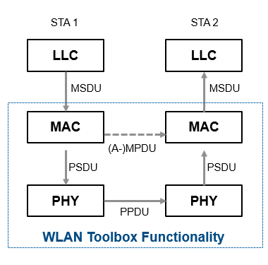 Функциональность инструментария WLAN сосредоточена на реализациях MAC и PHY. В частности, инструментарий моделирует обмен PPDU между одноранговыми узлами PHY и обмен MPDU или A-MPDU между одноранговыми узлами MAC. Здесь кратко описаны сообщения, которыми обмениваются уровни стека протоколов. Для получения дополнительной информации об этих сообщениях см. [2].