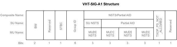 Поле VHT-SIG-A включает эти компоненты. Структуры битового поля для VHT-SIG-A1 и VHT-SIG-A2 изменяются для передач одного пользователя или нескольких пользователей.