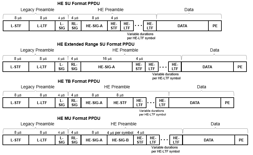 Поля RL-SIG, HE-SIG-A, HE-STF, HE-LTF и PE присутствуют во всех форматах HE PPDU. Поле HE-SIG-B присутствует только в PPDU MU HE. Для получения дополнительной информации см. раздел 27.3.4 [2].