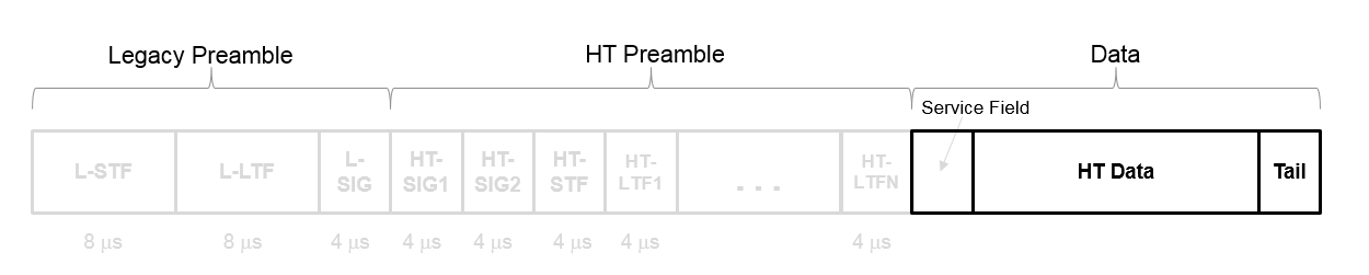 Поле HT-Data следует за последним полем обучения длиной HT (HT-LTF) смешанного пакета HT.