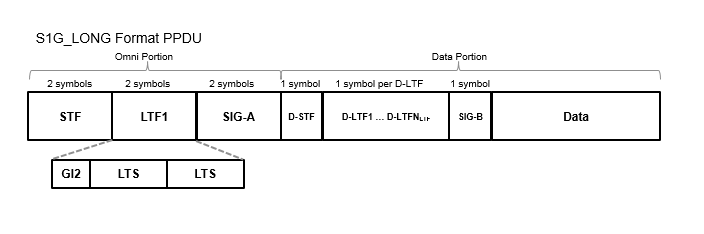 PPDU с длинной преамбулой S1G ≥2 МГц поддерживает однопользовательские и многопользовательские передачи. Длинная преамбула PPDU состоит из двух частей; ненаправленная часть и изменяемая лучом часть.