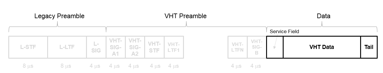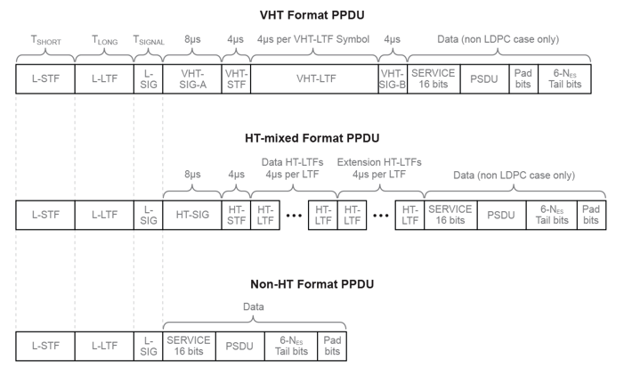 Структура поля для блоков PPDU VHT, HT и не-HT состоит из частей преамбулы и данных. Унаследованные поля преамбулы (L-STF, L-LTF и L-SIG) являются общими для преамбул формата VHT, HT и не-HT. Поля преамбулы формата VHT и HT включают дополнительные специфичные для формата поля обучения и сигнализации. Каждый формат определяет поле данных для передачи полезных данных пользователя.