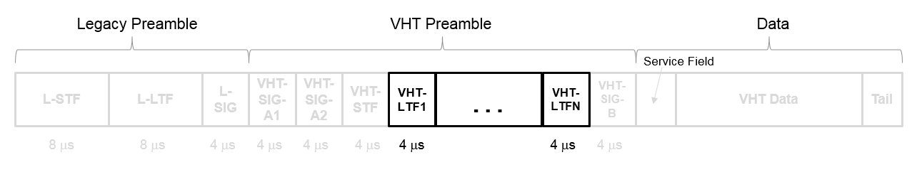 Очень высокая пропускная способность длинного обучающего поля (VHT-LTF) расположена между VHT-STF и VHT-SIG-B частью пакета VHT.