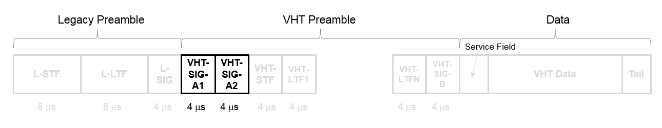 Подробное описание поля VHT-SIG-A см. в разделе 21.3.8.3.3 стандарта IEEE Standd 802.11-2016. Поле VHT-SIG-A состоит из двух символов: VHT-SIG-A1 и VHT-SIG-A2. Эти символы расположены между L-SIG и частью VHT-STF PPDU формата VHT.