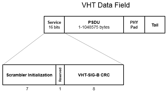 Поле обслуживания - содержит семибитовое состояние инициализации скремблера, один бит, зарезервированный для будущих соображений, и восемь битов для поля проверки циклическим избыточным кодом (CRC) VHT-SIG-B.