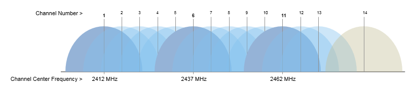 В целом, полосы частот 2,4 ГГц и 5 ГГц работы обозначают каналы, разнесенные на 5 МГц, с отмеченными исключениями. Например, полоса 2,4 ГГц обозначает каналы 1-13, отстоящие друг от друга на 5 МГц, плюс 14-й канал 12 МГц от канала 13. Определенные полосы пропускания каналов WLAN превышают 5 МГц, поэтому кросс-канальные помехи ограничивают количество назначенных используемых каналов. Развертывания точек доступа управляют помехами от соседних ячеек, работая на неперекрывающихся каналах. В Соединенных Штатах диапазоны 2,4 ГГц, обозначенные как используемые неперекрывающиеся каналы, составляют 1, 6 и 11.