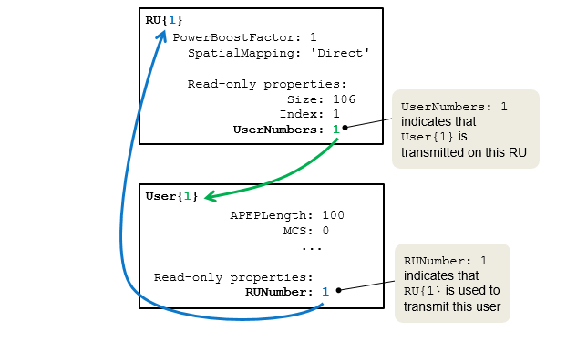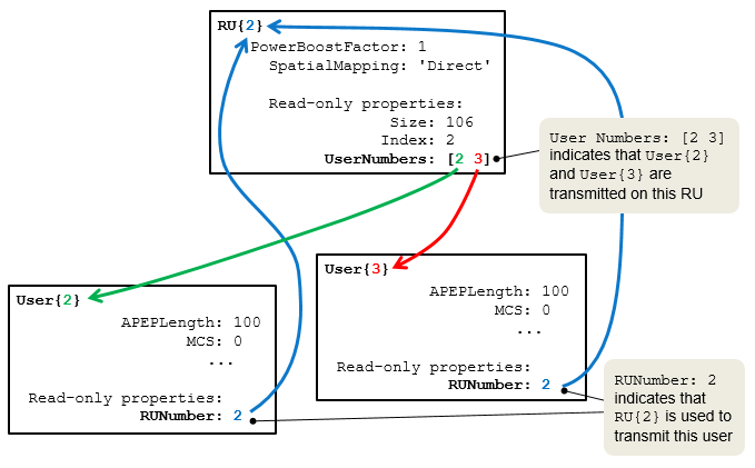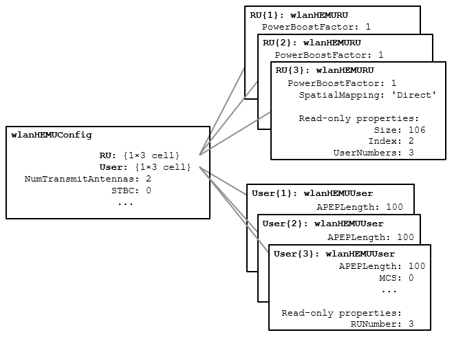 При создании wlanHEMUConfig объект, свойства устанавливаются на основе выбранного AllocationIndex и любые включенные пары «имя-значение». При создании объекта, RU и User сконфигурированы массивы ячеек. RU элементы массива ячеек содержат свойства конфигурации для каждого RU. User элементы массива ячеек содержат свойства конфигурации для каждого пользователя.