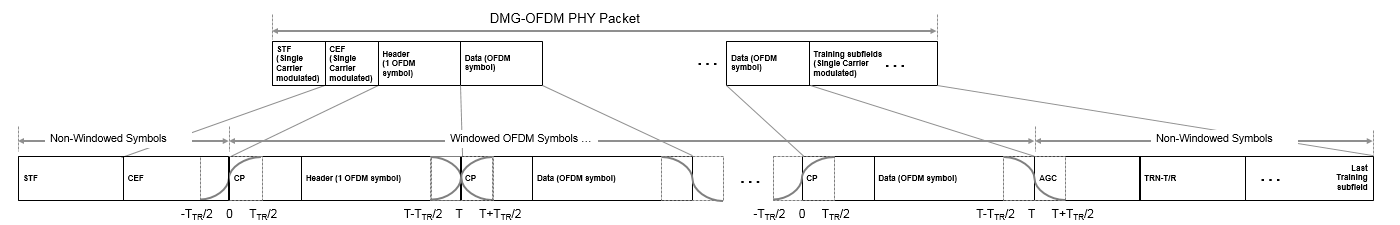 Для формата DMG оконное отображение применяется только к пакетам, переданным с использованием OFDM PHY, и применяется только к OFDM модулированным символам. Для OFDM PHY только символы заголовка и данных модулируются OFDM. Преамбула (STF и CEF) и обучающие поля модулированы с одной несущей и не отображаются в окне. Подобно внеполосным излучениям, испытываемым последовательными OFDM-символами, как показано здесь, CEF и первое обучающее подполе подвержены номинальной величине внеполосных излучений от соседнего оконного OFDM-символа.
