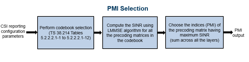 PMI является набором индексов, соответствующих матрице предварительного кодирования, которая может использоваться для нисходящей передачи данных. Кодовая книга выбирается из набора возможных кодовых книг, определенных в TS 38.214 Таблицы 5.2.2.1-1-5.2.2.2.1-12, на основе возможного количества слоев передачи для параметров конфигурации передачи по нисходящей линии связи и CSI, такие как размерности антенной панели и режим кодовой книги. Кодовая книга состоит из набора матриц предварительного кодирования. Для заданных условий канала отношение сигнал/помеха и шум (SINR) вычисляется на стороне приемника путем рассмотрения всех матриц предварительного кодирования из выбранной кодовой книги. Индексы матрицы предварительного кодирования, которая дает максимальное SINR, сообщаются как PMI (составляющий два набора индексов как определено в ТУ 38.214 раздел 5.2.2.2.1). Рисунок показывает процедуру выбора PMI.