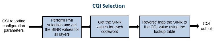 Значение CQI вычисляется путем принятия значений SINR, которые соответствуют сообщенному PMI, с помощью предварительно вычисленной интерполяционной таблицы индекса CQI против , как ссылку. Значения SINR во всех слоях (соответствующих сообщенному PMI) сопоставляются с каждым кодовым словом. Для каждого кодового слова соответствующий SINR сравнивается с значения из таблицы и затем выбирается значение CQI относительно максимального SINR, которое меньше, чем значение SINR кодового слова. Значение CQI выбирается таким образом, чтобы BLER был меньше или равен 0,1 при работе с . Если индекс CQI, равный 1, не удовлетворяет условию BLER, то индекс CQI рассматривается как 0. Рисунок показывает процедуру выбора CQI.