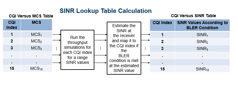 Интерполяционные таблицы могут быть созданы путем обновления NewRadioPDSCHThroughputExample конфигурирование справочного ресурса CSI, как определено в TS 38.214 Раздел 5.2.2.5. Симуляции для пропускной способности PDSCH выполняются путем принятия схемы модуляции и скорости кода, соответствующих каждому CQI, принимая во внимание определенные условия канала и через конечную область значений значений SINR с нулевой интерференцией. Значение SINR, наблюдаемое в приемнике, где достигается целевой BLER, сопоставляется с каждым индексом CQI. Рисунок показывает процедуру для CQI по сравнению с созданием таблицы SINR.