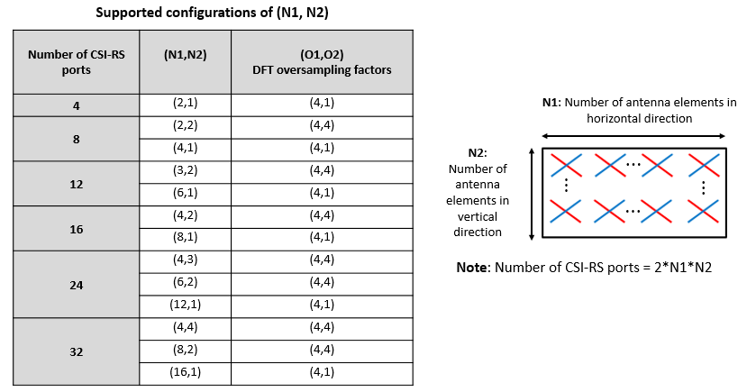 Размеры панели: Размерности панели антенны [N1 N2] в соответствии с TS 38.214 Таблица 5.2.2.2-2, как показано на рисунке
