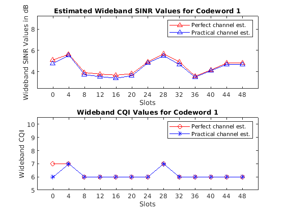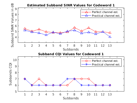 % Provide slot number for which subband CQI values and PMI i2 indices must be plotted slotNum = 1; % Consider slot number as 1 (1-based) here, because CSI (CQI and PMI) is % reported in that slot for the configured CSI-RS resource(s) plotSubbandCQIAndSINR(subbandCQIPractical,subbandCQIPerfect,SINRPerSubbandPerCWPractical,SINRPerSubbandPerCWPerfect,slotNum);