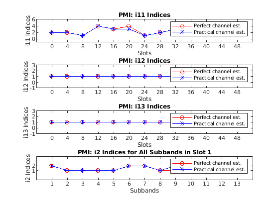 В этом разделе показаны графики индексов PMI ( и ). График подсвечивает только пазы, в которых передается CSI-RS, или вычисляется PMI. График подсвечивает изменения в индексы в пазах из-за замирания канала. График также подсвечивает изменение в индексы по всем: