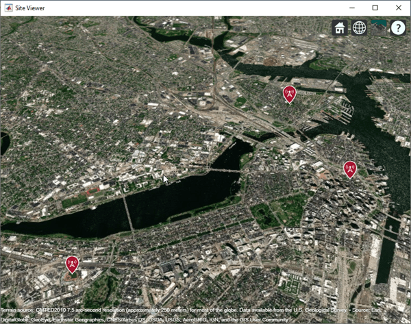 txs = txsite("Name",names,... "Latitude",lats,... "Longitude",lons, ... "TransmitterFrequency",2.5e9); show(txs)