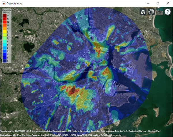 pdCapacity = propagationData(lats,lons,"Capacity",capacity); sv2 = siteviewer("Name","Capacity map"); legendTitle = "Capacity" + newline + "(Mbps)"; contour(pdCapacity,"LegendTitle",legendTitle);