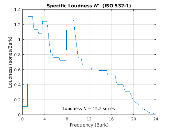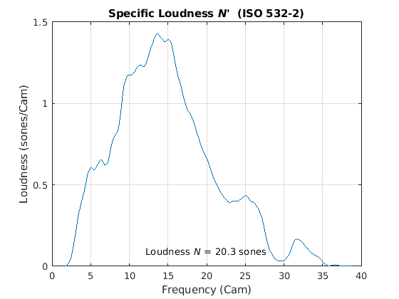 ISO 532-2 сообщает об особой громкости по шкале ERB, где 1.8:0.1:38.9 интервалы ERB. Модуль измерения шкалы ERB иногда упоминается как Cam. Преобразуйте интервалы ERB в Гц, а затем постройте график определенной громкости.
