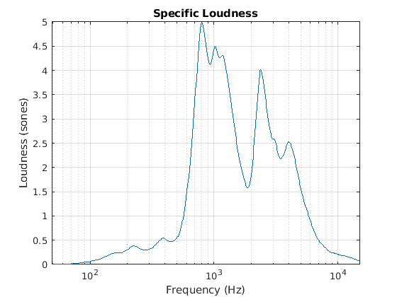 erbBins = 1.8:0.1:38.9; hzBins = erb2hz(erbBins); semilogx(hzBins,specificLoudness) xlabel('Frequency (Hz)') ylabel('Loudness (sones)') title('Specific Loudness') grid on
