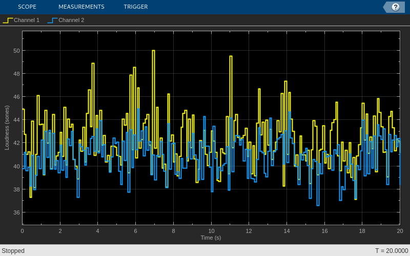 scope = timescope( ... 'SampleRate',1/frameDur, ... 'YLabel','Loudness (sones)', ... 'ShowGrid',true, ... 'PlotType','Stairs', ... 'TimeSpanSource','property', ... 'TimeSpan',20, ... 'AxesScaling','Auto', ... 'ShowLegend',true);