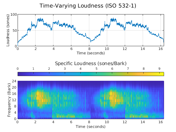 [~,~,perc] = acousticLoudness(audioIn,fs,'SoundField','diffuse','TimeVarying',true); fprintf('Max loudness = %0.2f sones\n',perc(1))