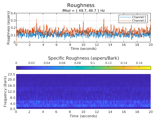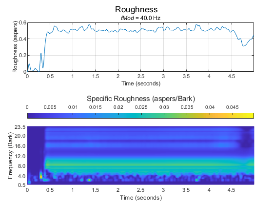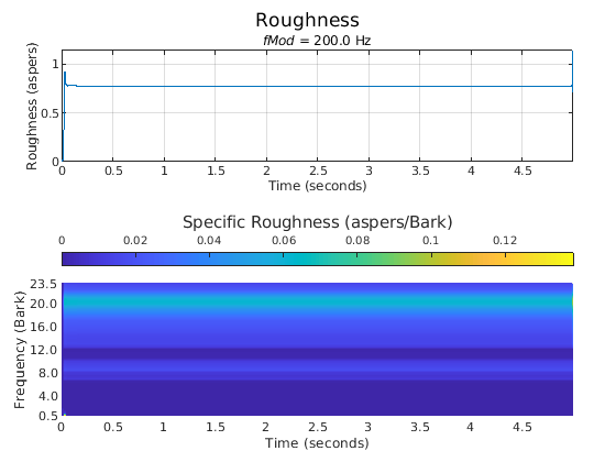 Сила акустической шероховатости является перцептивным измерением модуляций в амплитуде или частоте, которые являются слишком высокими, чтобы различать отдельно. Алгоритм акустической громкости описан в [2] и реализован в acousticLoudness функция. Расчет акустической шероховатости описан в [1]. Алгоритм для акустической шероховатости определяет шероховатость 1 аспера как тон 1 кГц на 60 дБ с 100% амплитудной модуляцией на 70 Гц [3]. Алгоритм описан следующим образом: