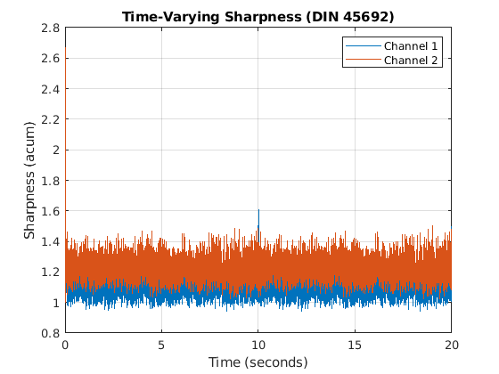 задает ненужный коэффициент калибровки микрофона, используемый для вычисления громкости.roughness = acousticRoughness(audioIn,fs,calibrationFactor)